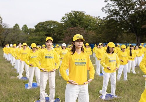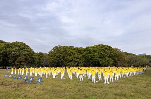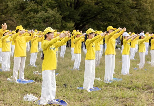 Praktisi Falun Dafa melakukan latihan di Taman Yoyogi.