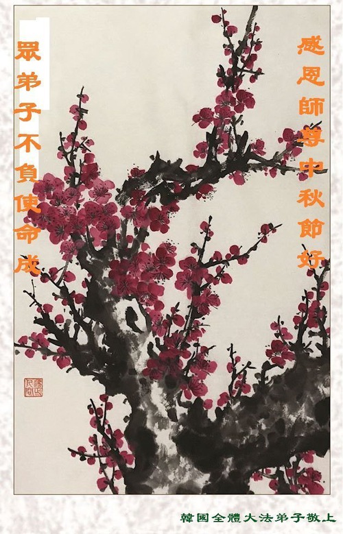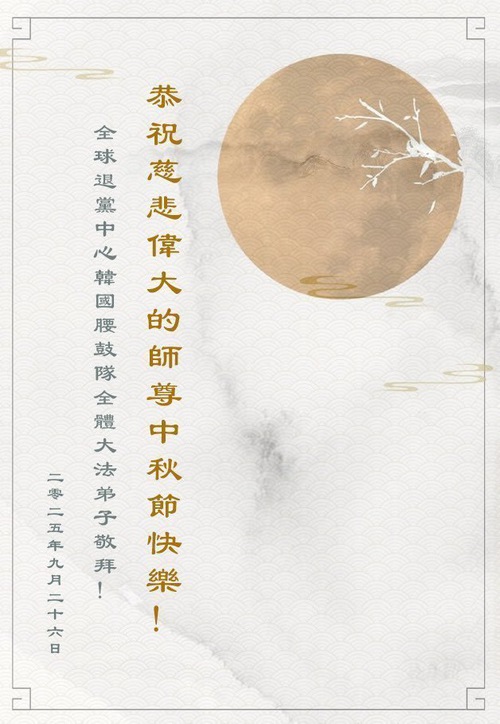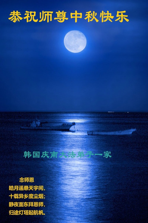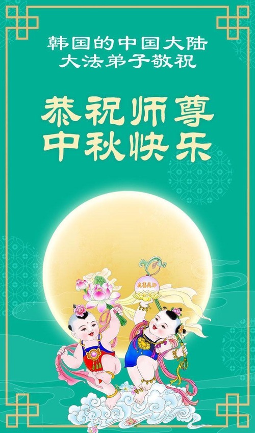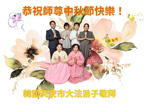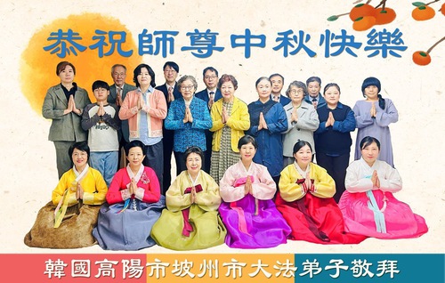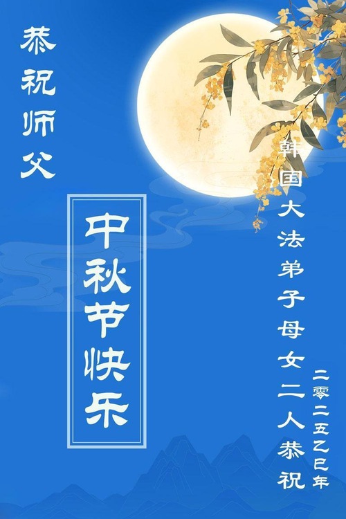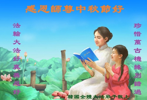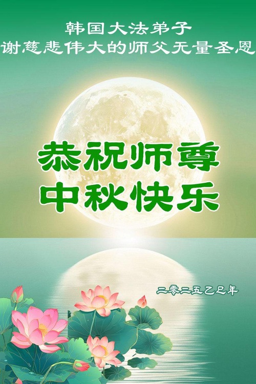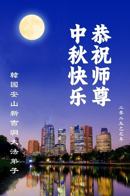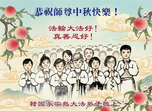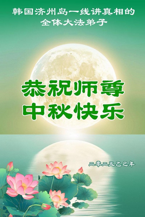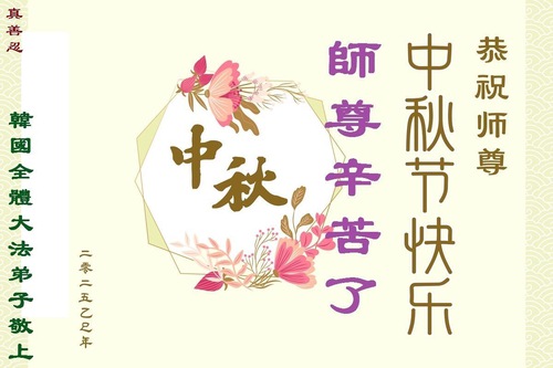 (Minghui.org) Dalam laporan ini, kami tampilkan ucapan selamat dari praktisi di Seoul, Pulau Jeju, Incheon, Pulau Yeongjong, Ansan, Provinsi Gyeongsang Selatan, Kota Chungsejong, Kota Gimhae, Kota Siheung, Kota Goyang, Provinsi Chungcheong Utara, Provinsi Jeolla Utara, Suwon, Kota Gimhae, Kota Cheonan, Bucheon, Kota Daejeon, Kota Daegu, Gwangju, Provinsi Jeolla Selatan, Provinsi Gyeongsang Utara, Gangwon, Yeongdong, Changwon, Haman, Ulsan, dan tempat-tempat lain di Korea Selatan. Mereka mengucapkan Selamat Merayakan Festival Pertengahan Musim Gugur kepada Guru Li.