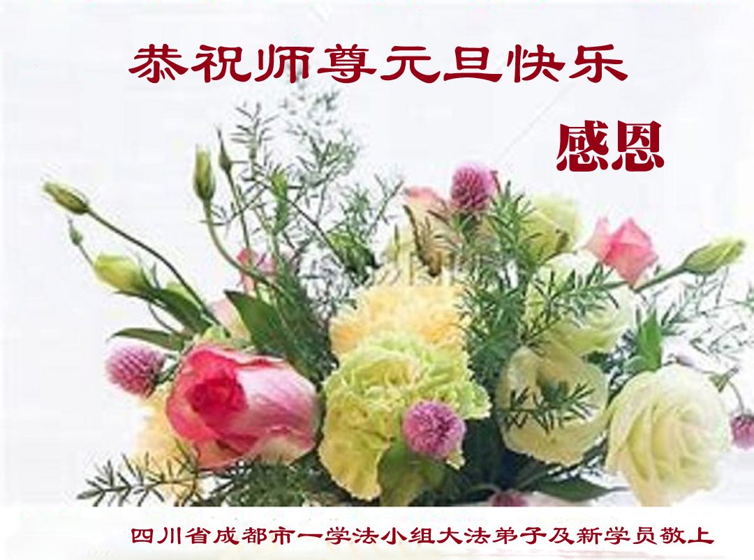 Para Praktisi dari Kelompok Studi Fa di Kota Chengdu, Provinsi Sichuan, bersama dengan Para Praktisi Baru, dengan Hormat Mengucapkan Selamat Tahun Baru kepada Guru!