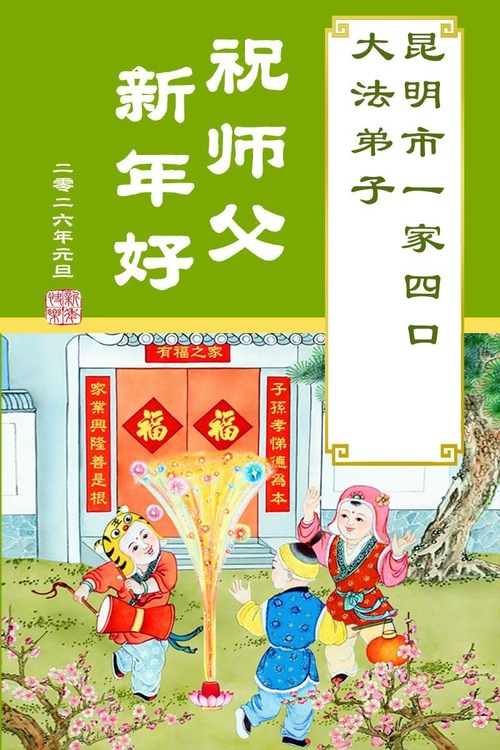 Sebuah Keluarga yang Beranggotakan Empat Praktisi, Bersama dengan Seorang Praktisi Baru di Kota Kunming, dengan Hormat Mengucapkan Selamat Tahun Baru kepada Guru Agung yang Baik Hati!